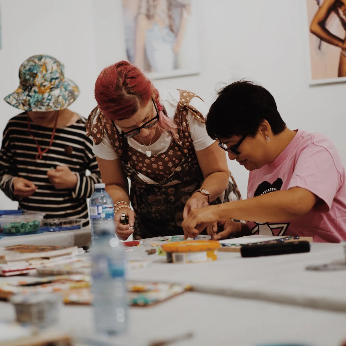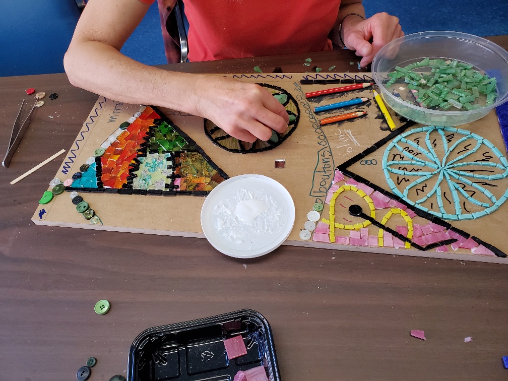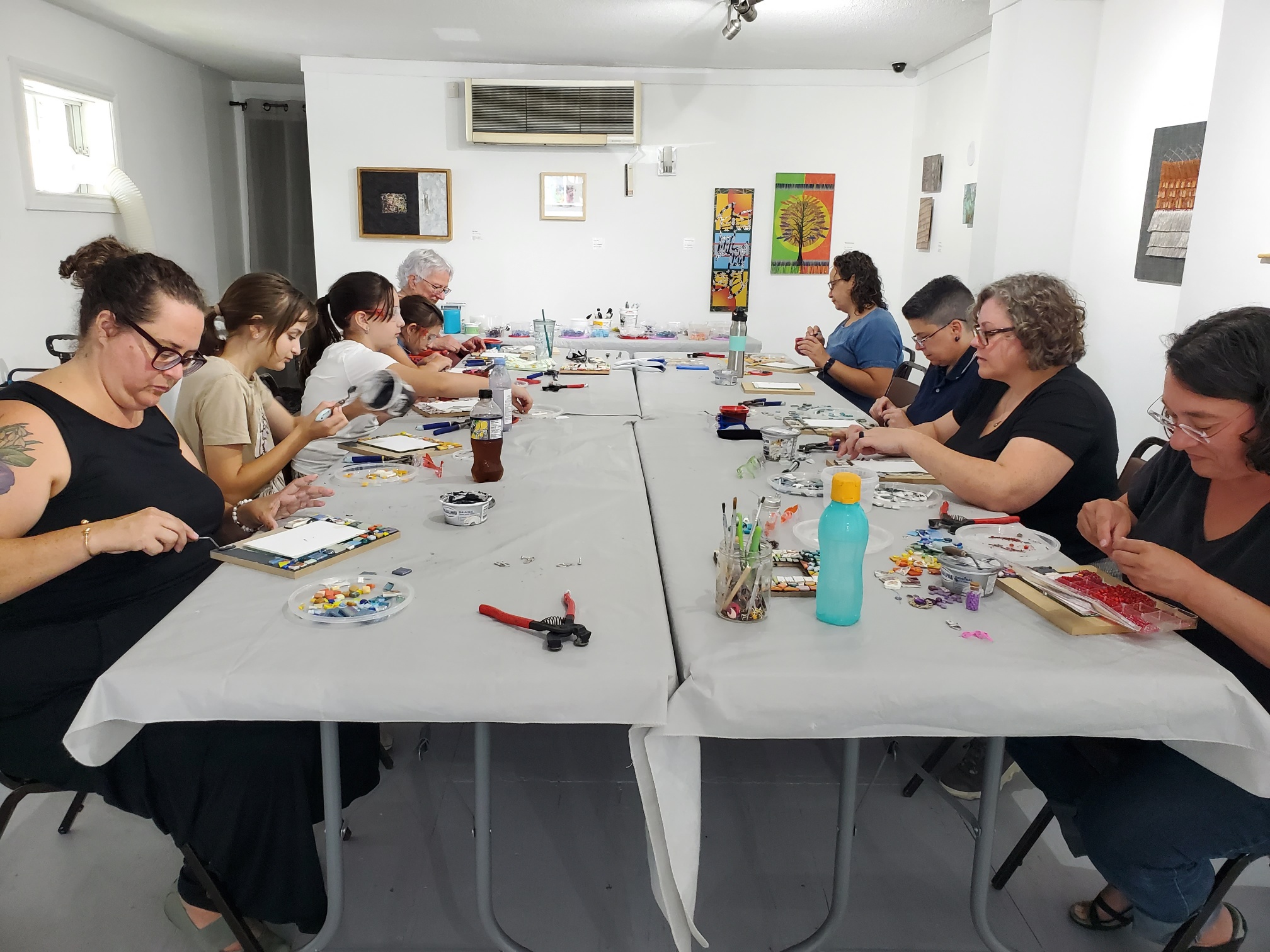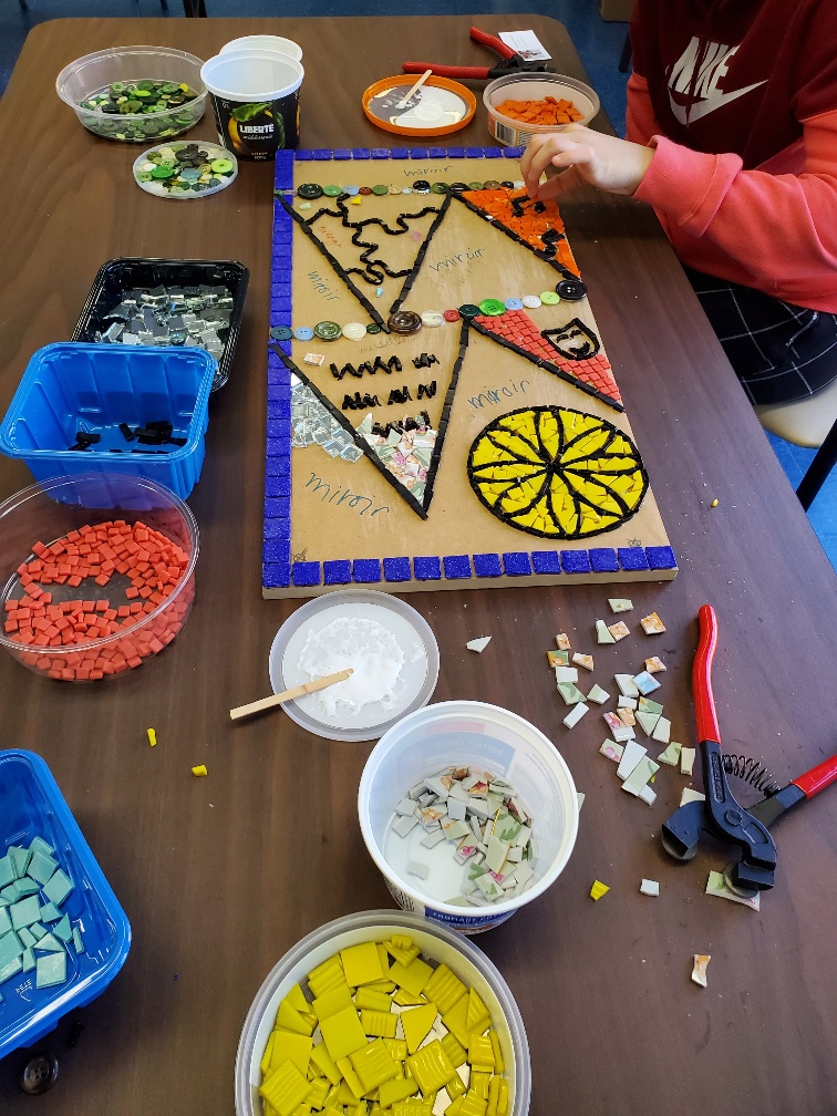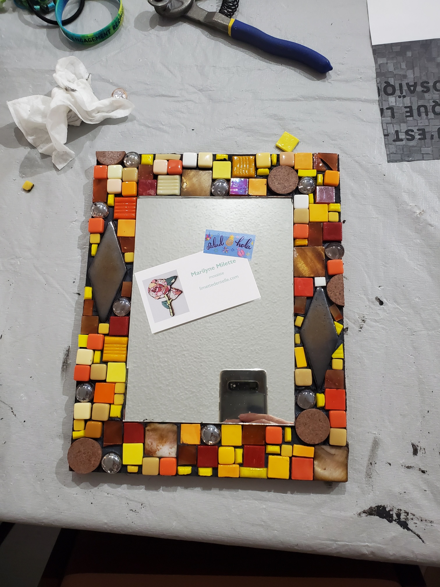 J’ai eu l’énorme privilège d’animer cinq de ces ateliers au courant de l’été 2024. Pour cet atelier, je me suis inspirée d’un atelier que j’ai suivi à Montréal auprès de l’artiste californienne Laurel Skye en 2011. La technique que j’ai apprise alors a changé ma pratique à jamais. Ci-contre, photo sur laquelle j’installe mon buffet de tesselles avant l’arrivée des participants. Crédit photo: Danielle Doucet.
