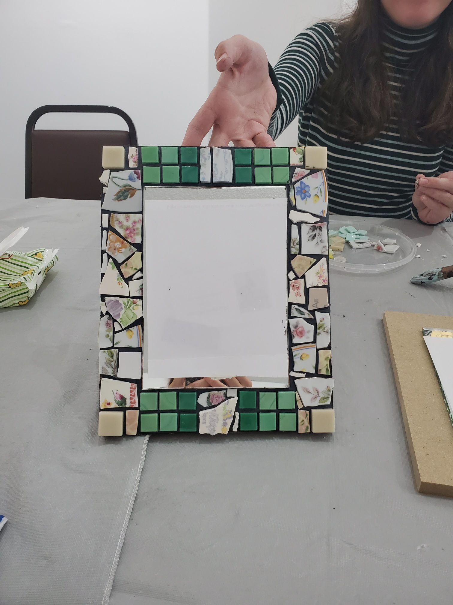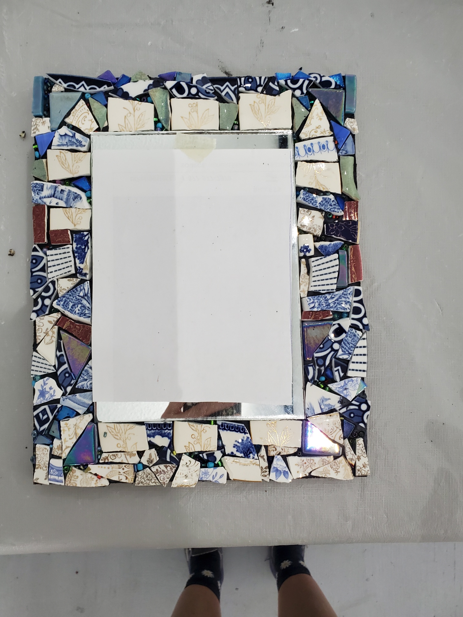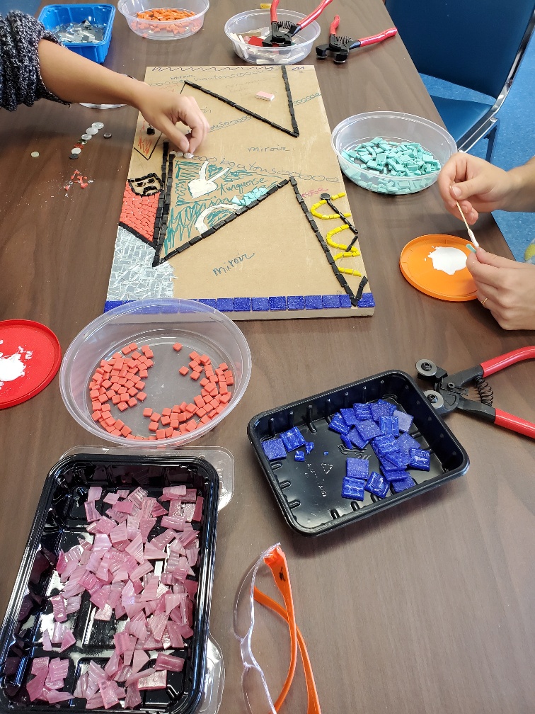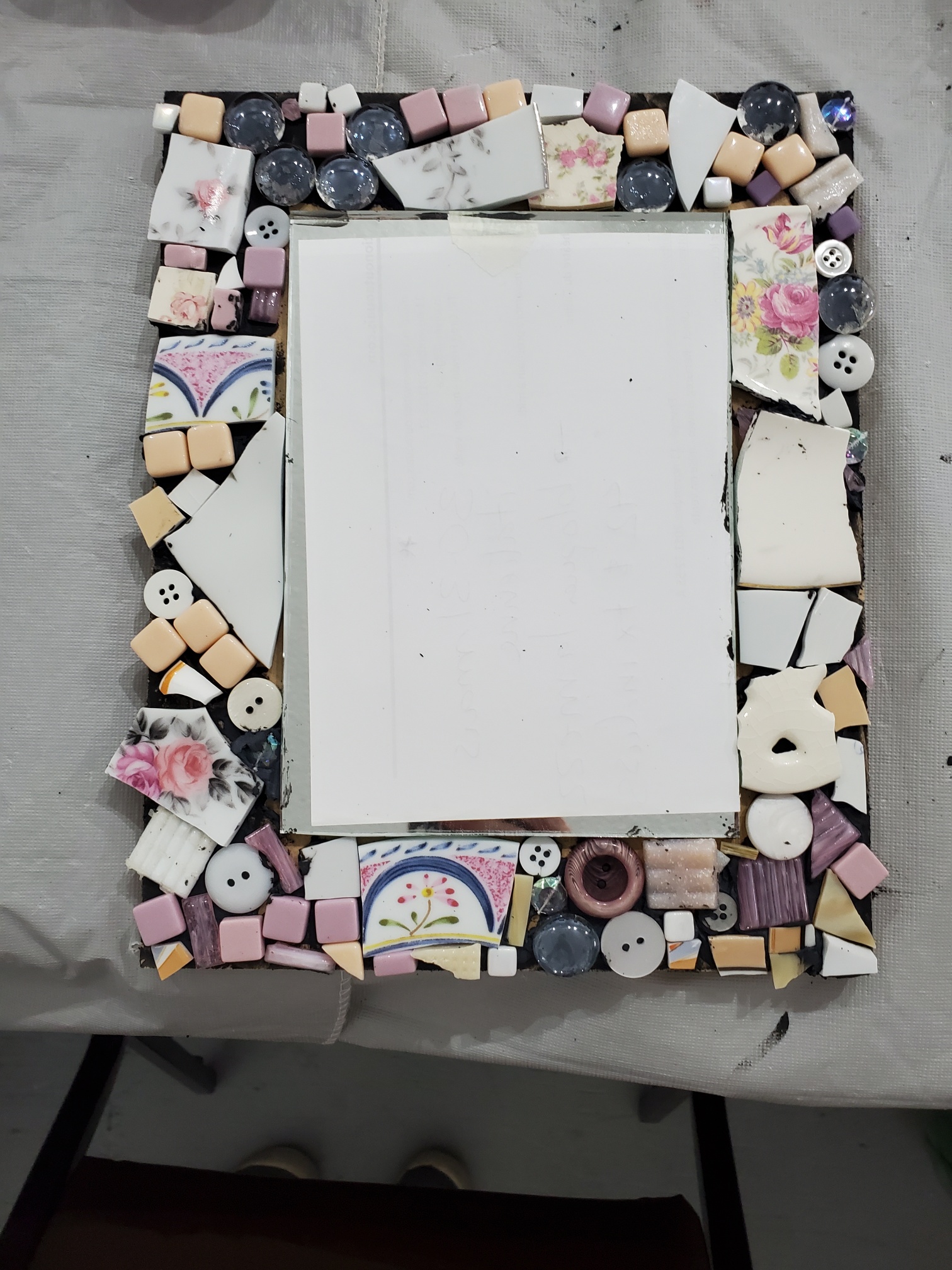 J’ai eu l’énorme privilège d’animer cinq de ces ateliers au courant de l’été 2024. Pour cet atelier, je me suis inspirée d’un atelier que j’ai suivi à Montréal auprès de l’artiste californienne Laurel Skye en 2011. La technique que j’ai apprise alors a changé ma pratique à jamais. Ci-contre, photo sur laquelle j’installe mon buffet de tesselles avant l’arrivée des participants. Crédit photo: Danielle Doucet.