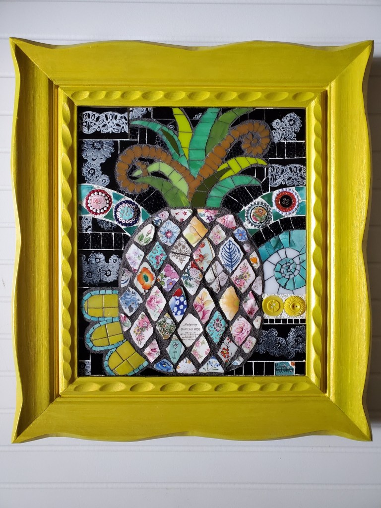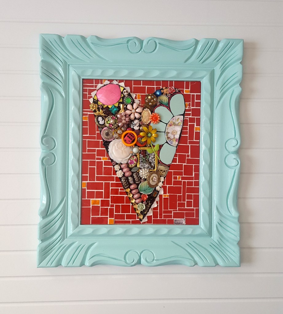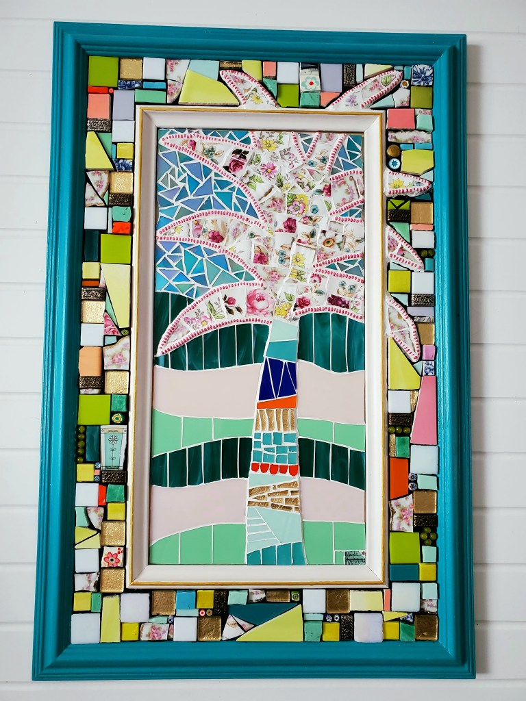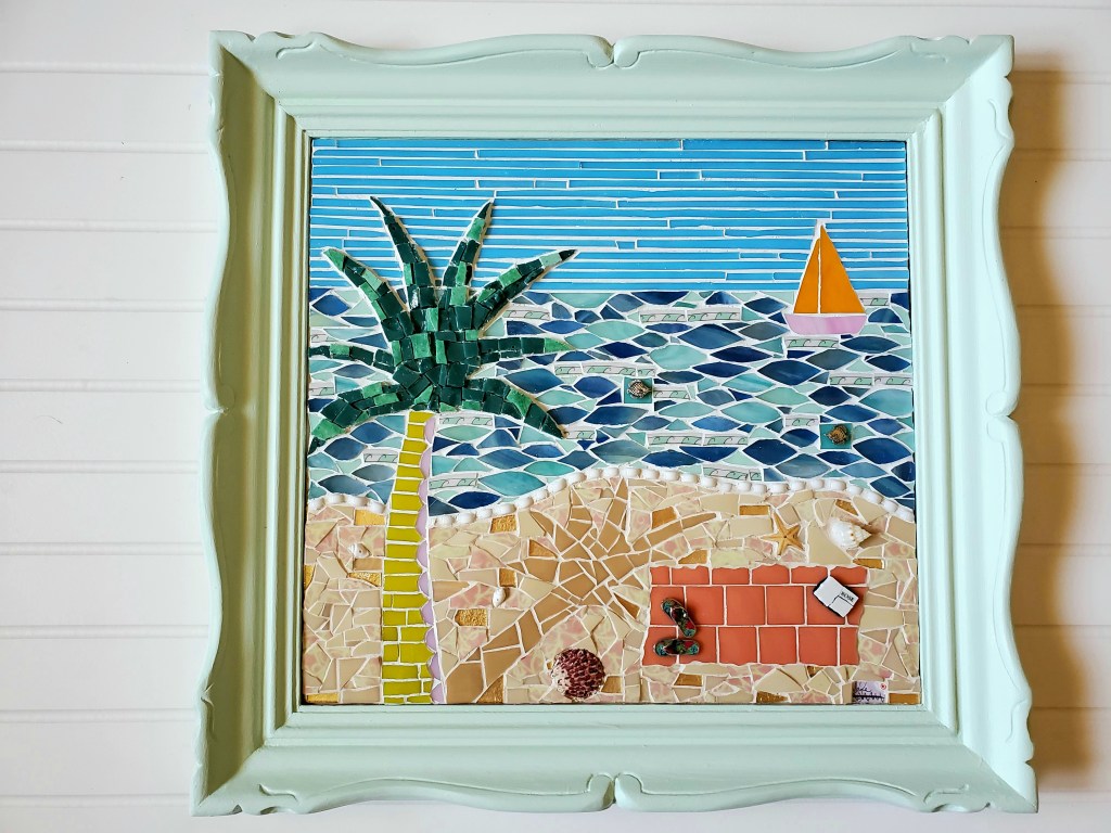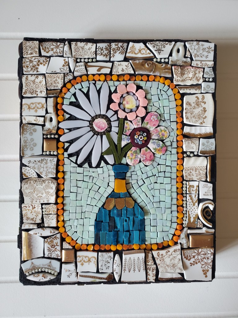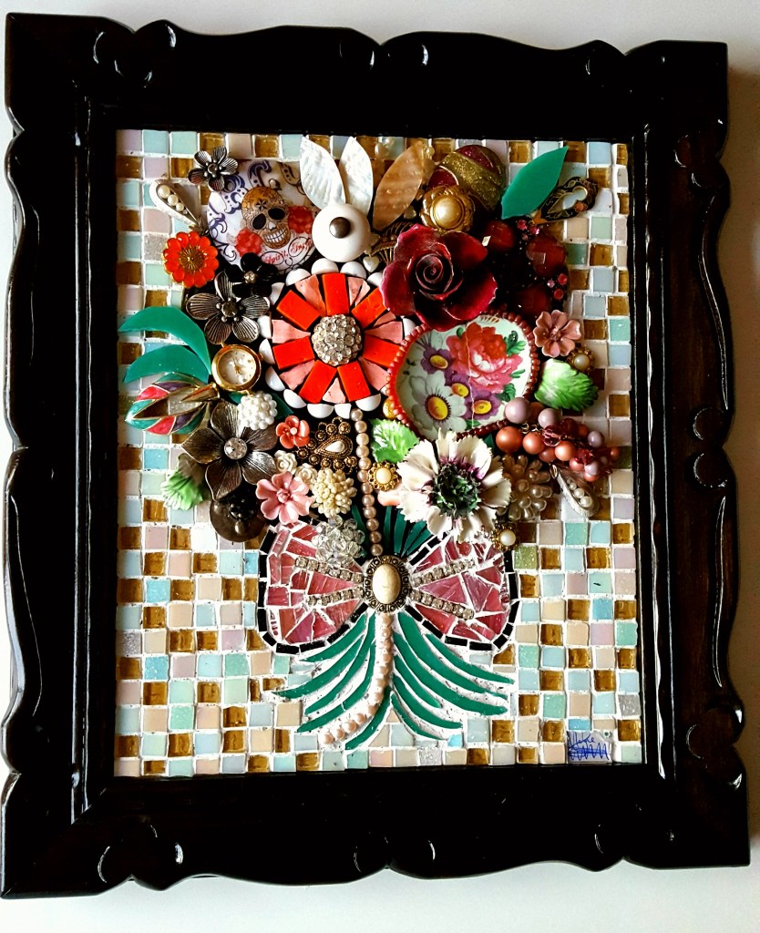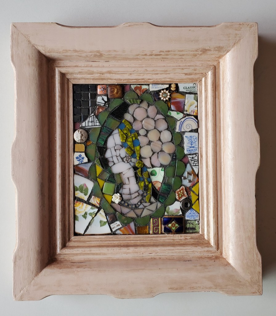 Verre, pâte de verre porcelaine récupérée, cadre récupéré, sur bois