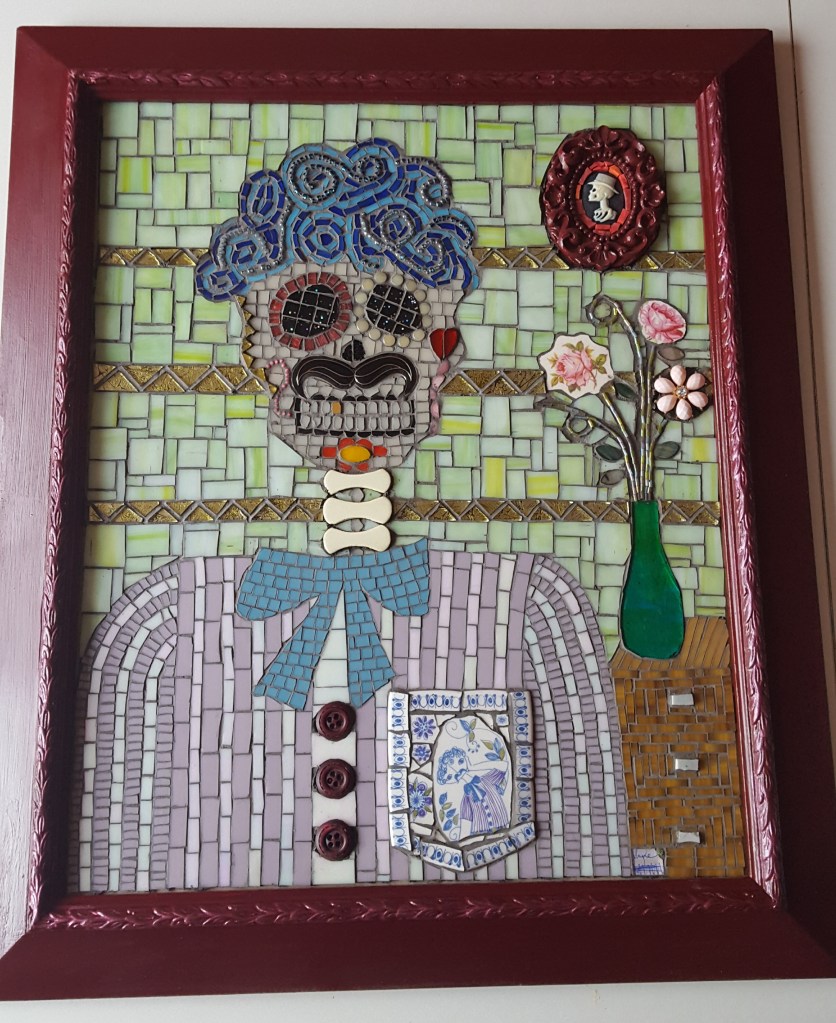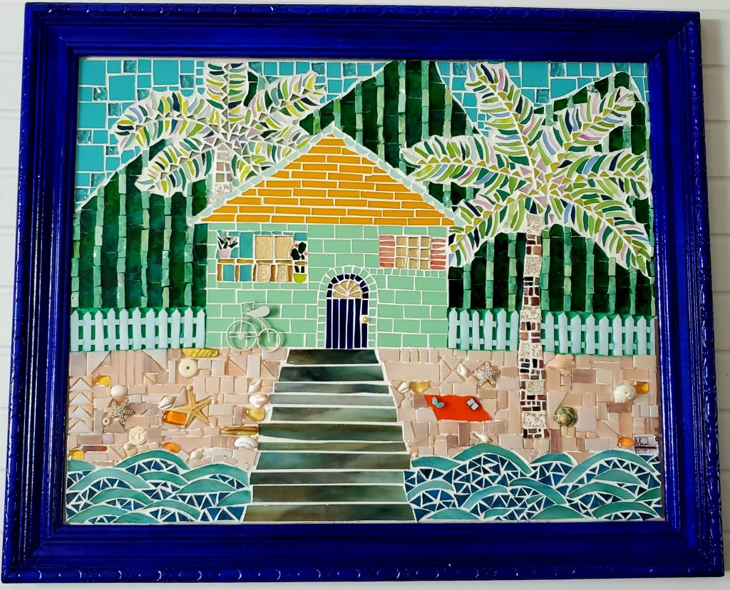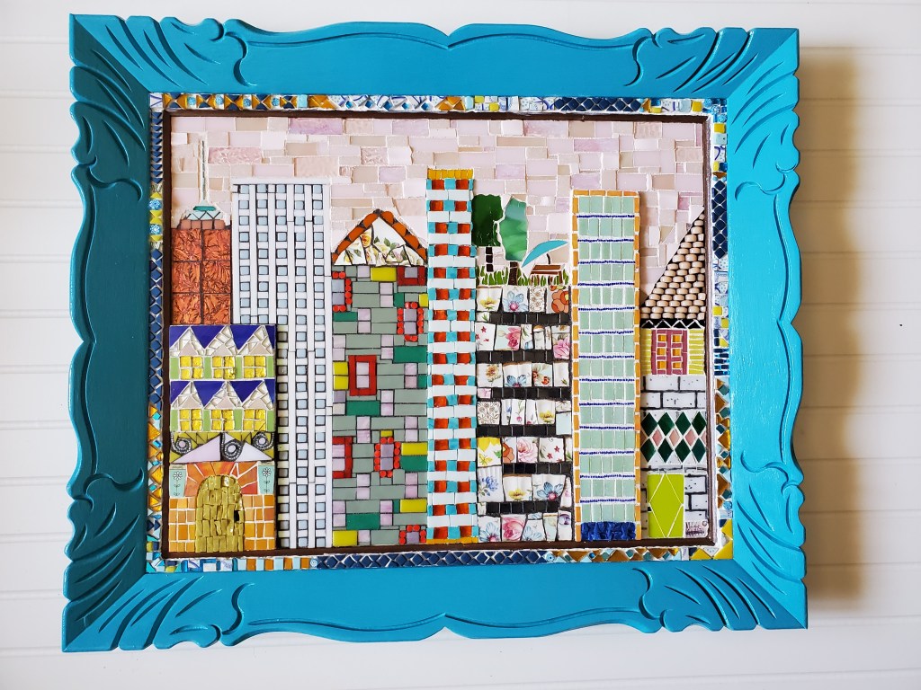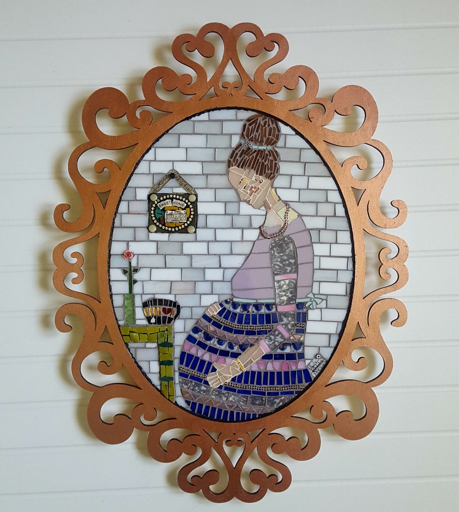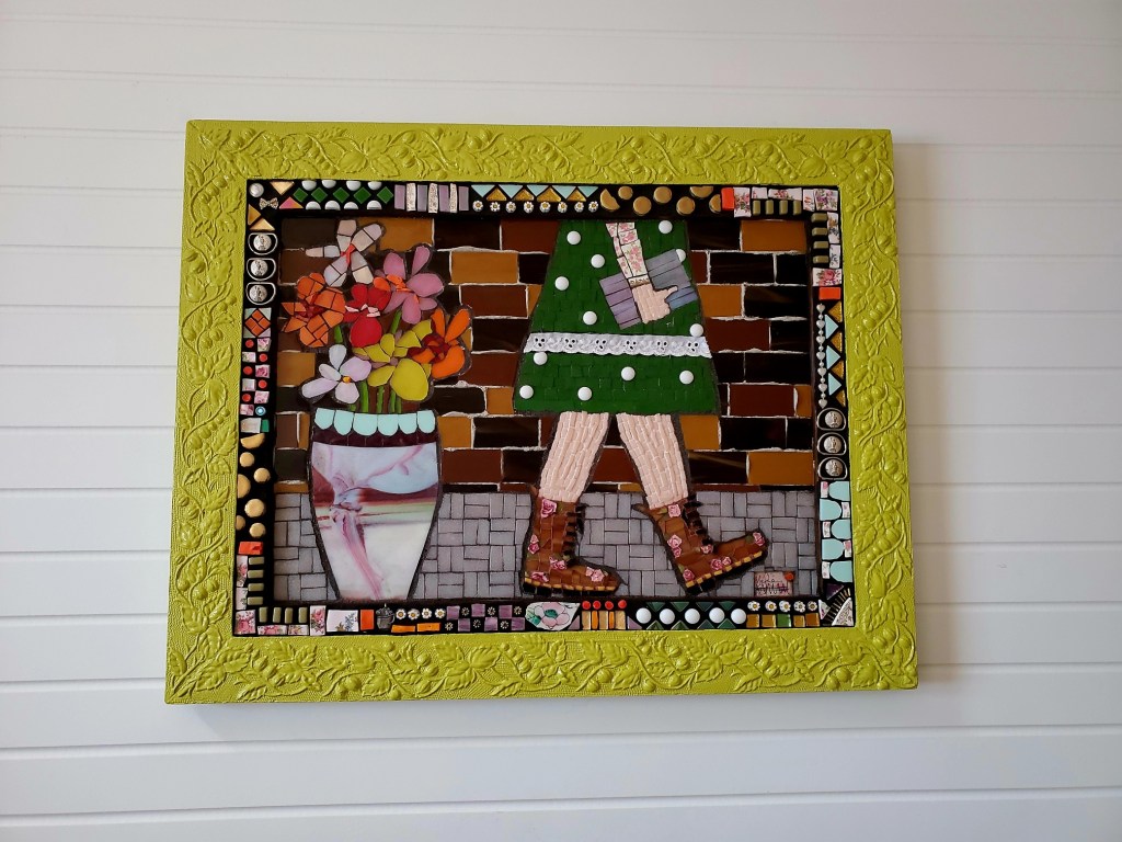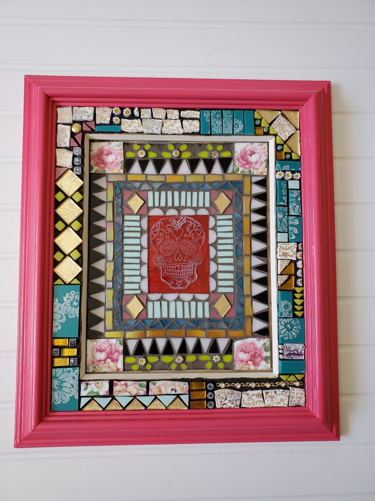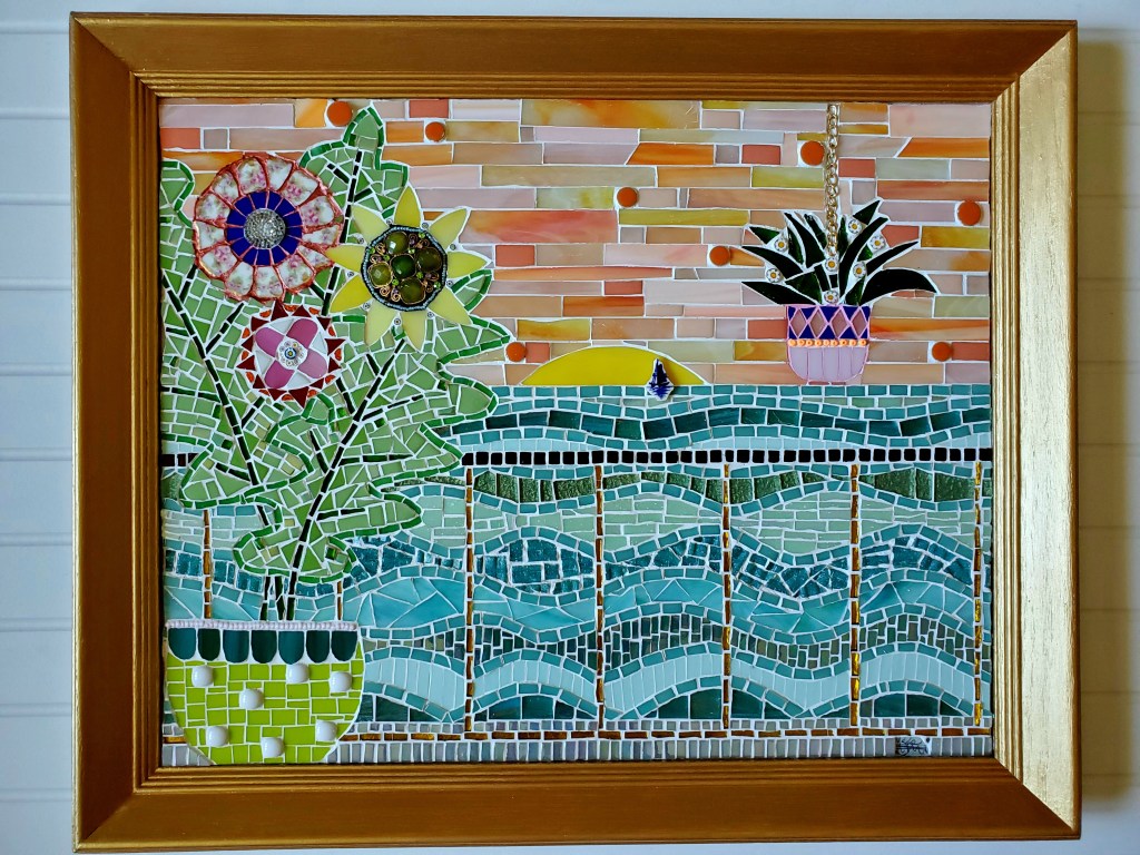 Verre, pâte de verre porcelaine récupérée, cadre récupéré, sur bois