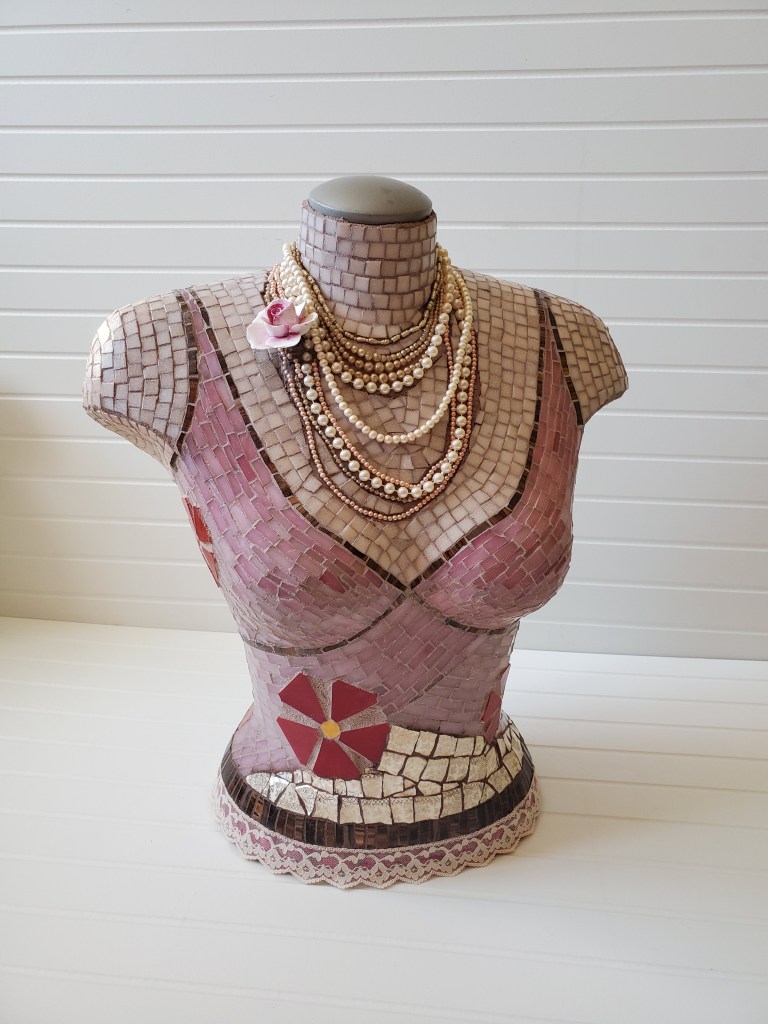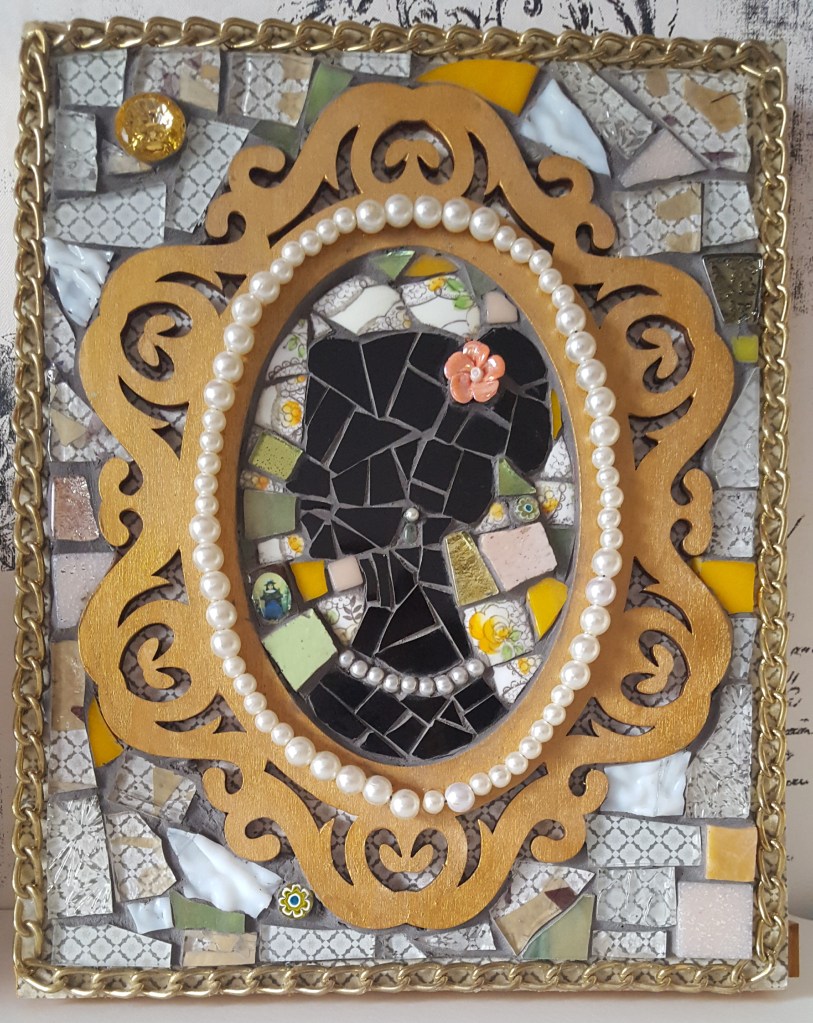 Verre, perles, fleur en verre récupérée, porcelaine cassée, dentelle,