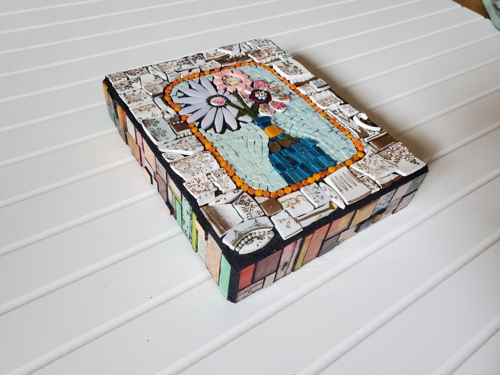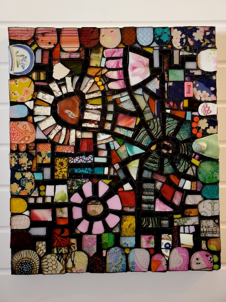 Verre, smalti, porcelaine dorée, millefioris, papier japonais, sur bois