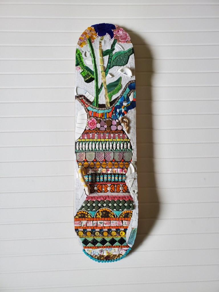 Planche de skateboard, porcelaine, pâte de verre, smalti, bijoux recyclés, boutons