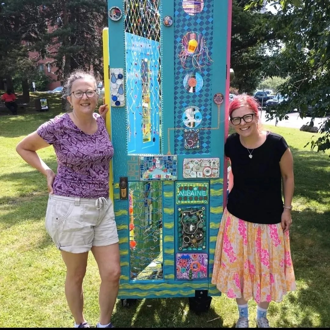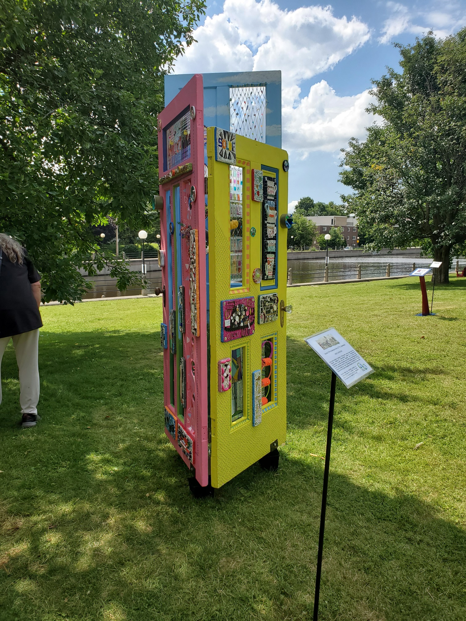 Avec Carole Cyr, artiste multi-disciplinaire, nous avons créé cette sculpture de matériaux recyclés. ” En recherchant un concept, nous n’avons retenu que les idées pouvant être réalisées avec des objets et du matériel récupéré et résistant aux intempéries. Nous avons baptisé la sculpture « Prêt-à-porter » parce qu’elle réunit une foule d’objets produits en série qui deviennent vite obsolescents et par allusion, bien sûr, aux trois portes qui la composent. En rapprochant le textile mixte de la mosaïque nous avons voulu réunir la transparence et la légèreté du textile au poids et à la densité de la mosaïque. Nous avons aussi débridé notre goût partagé pour les couleurs vives.